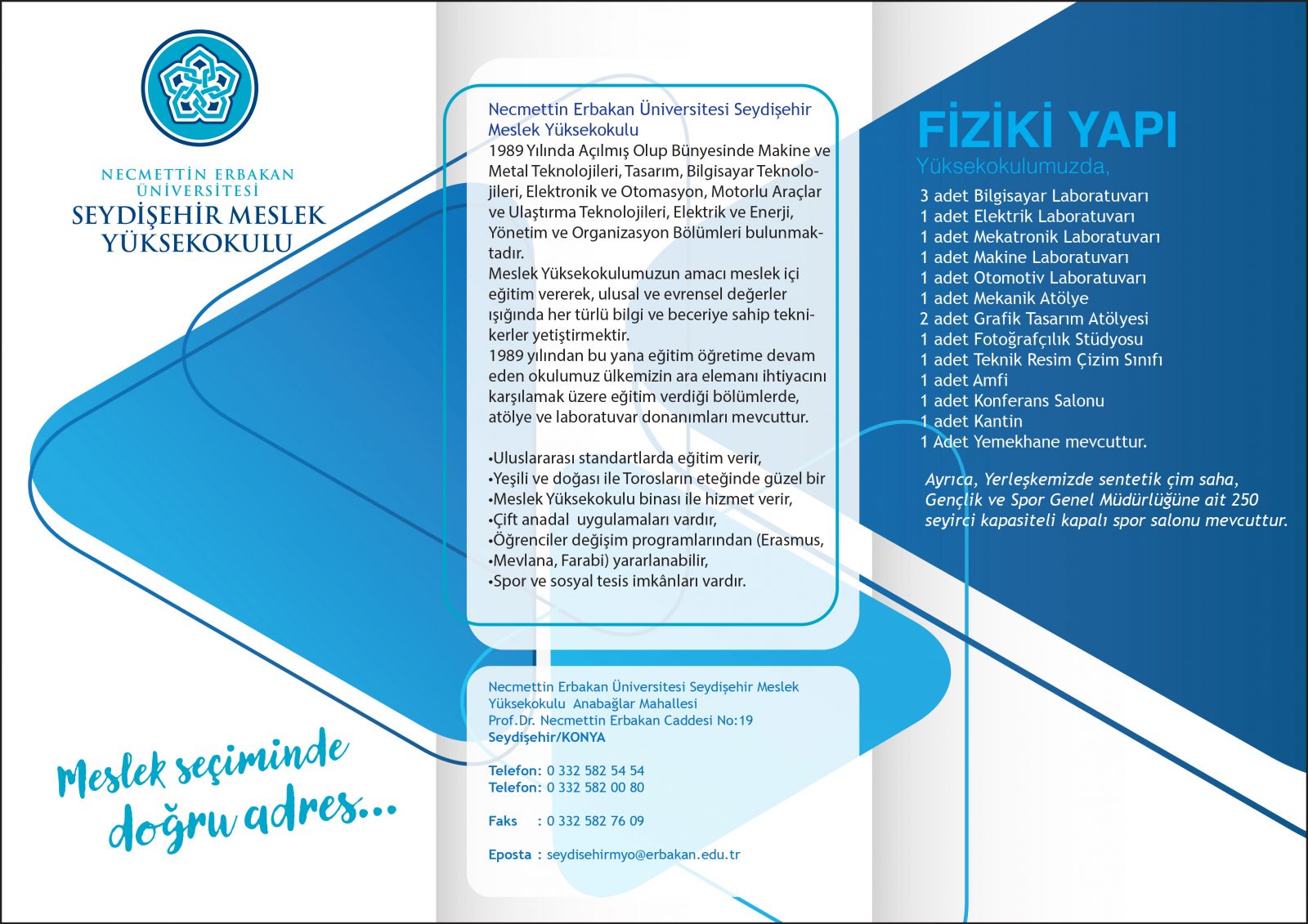 Kıymetli öğrencilerimiz Değerli velilerimiz Seydişehir’de bulunan Necmettin Erbakan Üniversitesi Seydişehir Yerleşkesi Ahmet Cengiz Mühendislik Fakültesi, Kamil Akkanat Sağlık Bilimleri Fakültesi, Seydişehir Meslek Yüksekokulu ve Seydişehir Sağlık Hizmetleri Meslek Yüksekokulunda öğrencilerimizin tercih edebileceği lisans Makine Mühendisliği, Bilgisayar Mühendisliği, Hemşirelik Bölümü ile Ön lisans İşletme, Elektrik, Grafik Tasarım, Mekatronik, Makine, Bilgisayar Programı ile Fizyoterapi Programları hakkında bilgi alınması ve ziyaret edilebilmesi için 29 Temmuz 2 Ağustos 2024 günleri arası tüm Fakülte ve Yüksekokullarda tanıtım günleri düzenlenecektir. Tüm veli ve öğrencilerimizi Üniversite Yerleşkemize bekleriz.