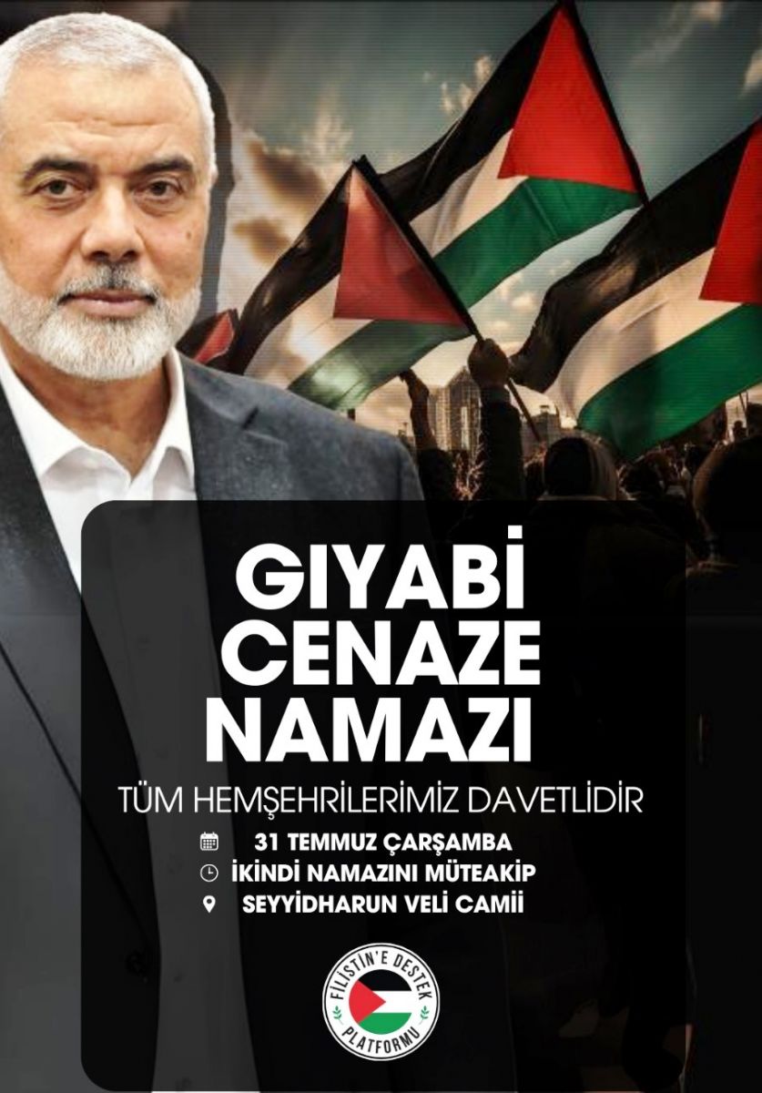 Şehit Hamas lideri İsmail Haniye için bugün Seydişehirde gıyabi cenaze namazı kılınacak. Seydişehir Sivil Toplum örğütleri ve Seydişehir Merkez Camilerinden verilen sela ile tüm Seydişehirli vatandaşlar ikindi namazı sonrası Seyyidharun Veli Camii önüne davet edildi.