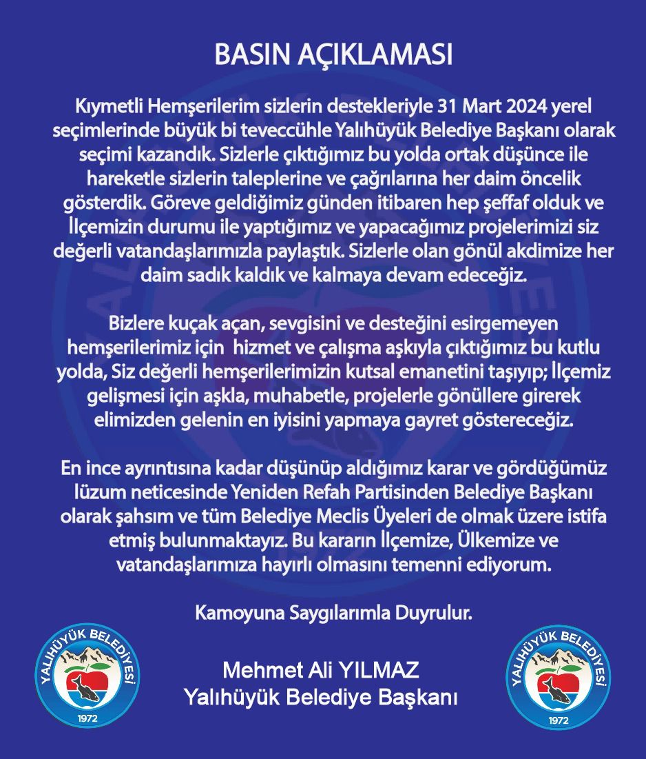 31 Mart 2024 tarihinde yapılan yerel seçimlerde yüzde 59,51 gibi rekor bir oyla Yalıhüyük Belediye Başkanı seçilen Mehmet Ali Yılmaz, partisinden istifa ettiğini duyurdu.