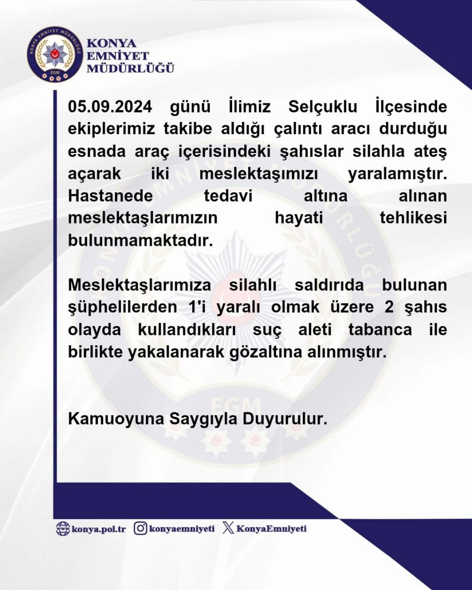 KONYA (AA) - Konya'nın Selçuklu ilçesinde polis tarafından takip edilen çalıntı otomobildeki şüpheliler, kendilerini durduran polis ekiplerine ateş açtı, 2 memur yaralandı.