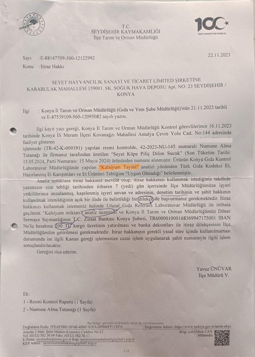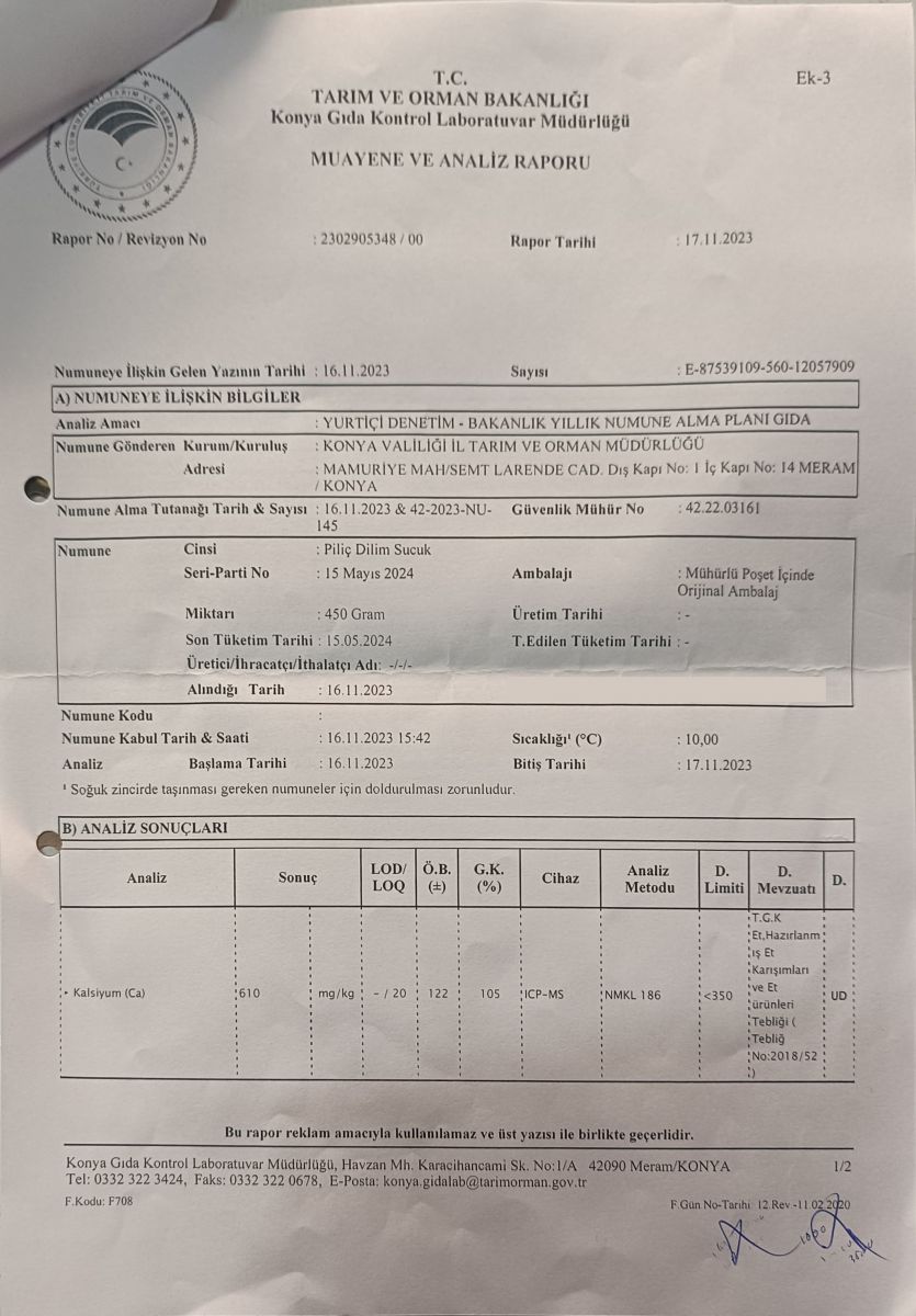 Son dönemde bakanlığın açıkladığı bazı hileli ürün raporlarında firmamızında adının geçmesi , bizleri son derece üzmüştür., Küpe Marka Tavuk Sucuğumuzla ilgili Tarım ve Orman Bakanlığı’nın belirlediği kalibrasyon standartlarına aykırı bir durumun söz konusu olduğunu belirtmek isteriz. Yapılan analize göre, 1 kilogram Küpe Marka Tavuk Sucuğumuzda tespit edilen kalsiyum oranı, 0,61 gram olarak belirlenmiştir. Oysaki standartlara göre, bu oranın 0,35 gram olması gerektiği belirtilmektedir. Bu durumun, tavuk etini tedarik ettiğimiz firma kaynaklı bir hata olduğunu üzülerek ifade ediyoruz.