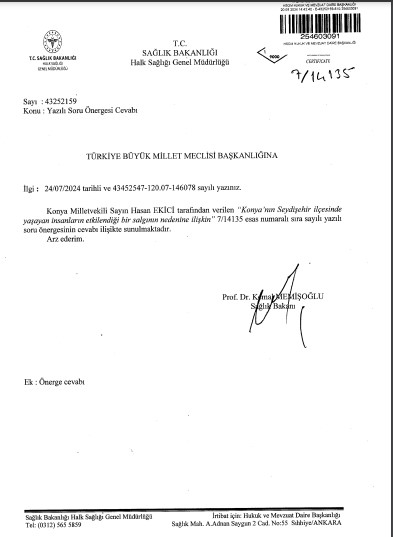 Seydişehir’de Haziran ayında yaşanan ve uzun süre tartışmalara neden olan salgının nedenine dair önemli bilgilere yer vereceğiz. Konya milletvekili Hasan Ekici’nin Türkiye Büyük Millet Meclisi'nde (TBMM) Sağlık Bakanlığına yönelttiği soru önergesinin yanıtı gündeme damgasını vurdu.