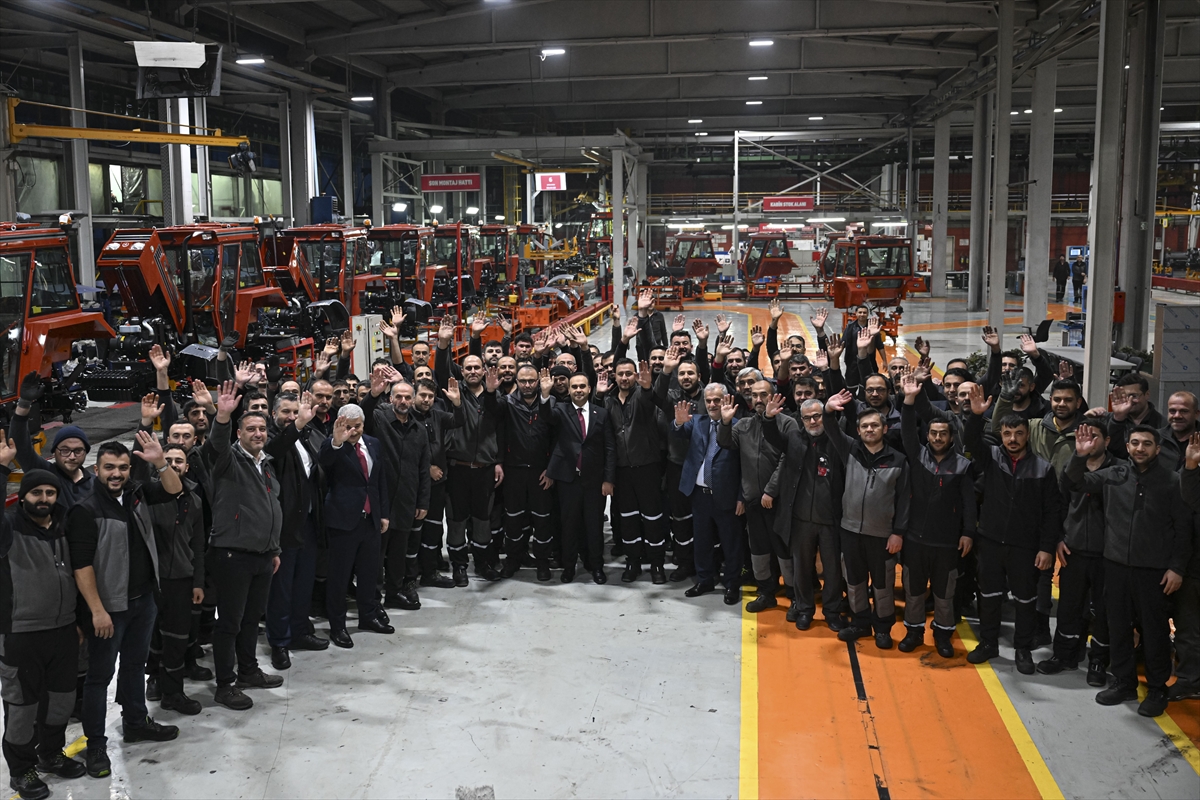Fabrikada üretilen traktöre binen Kacır, çalışanlarla da hatıra fotoğrafı çektirdi.