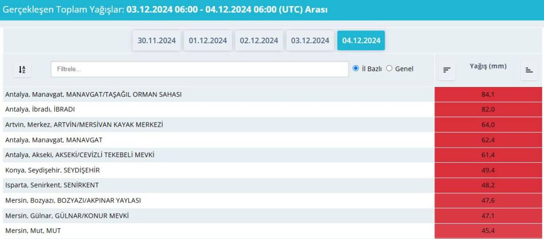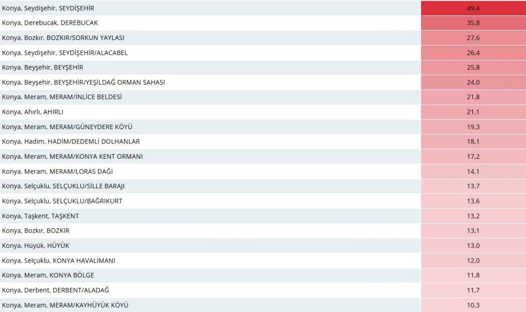 Konya, 03 Aralık 2024 saat 06.00 ila 04 Aralık 2024 06.00 saatleri arasında Antalya ve Artvin’den sonra Türkiye’de en çok yağış alan 3. şehir oldu.