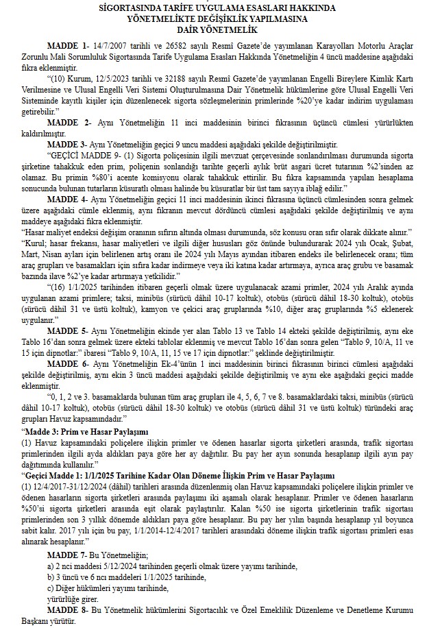 Diğer araç gruplarında ise yüzde 5 zam uygulanacak. Söz konusu artışlar 1 Ocak 2025 itibarıyla geçerli olacak.