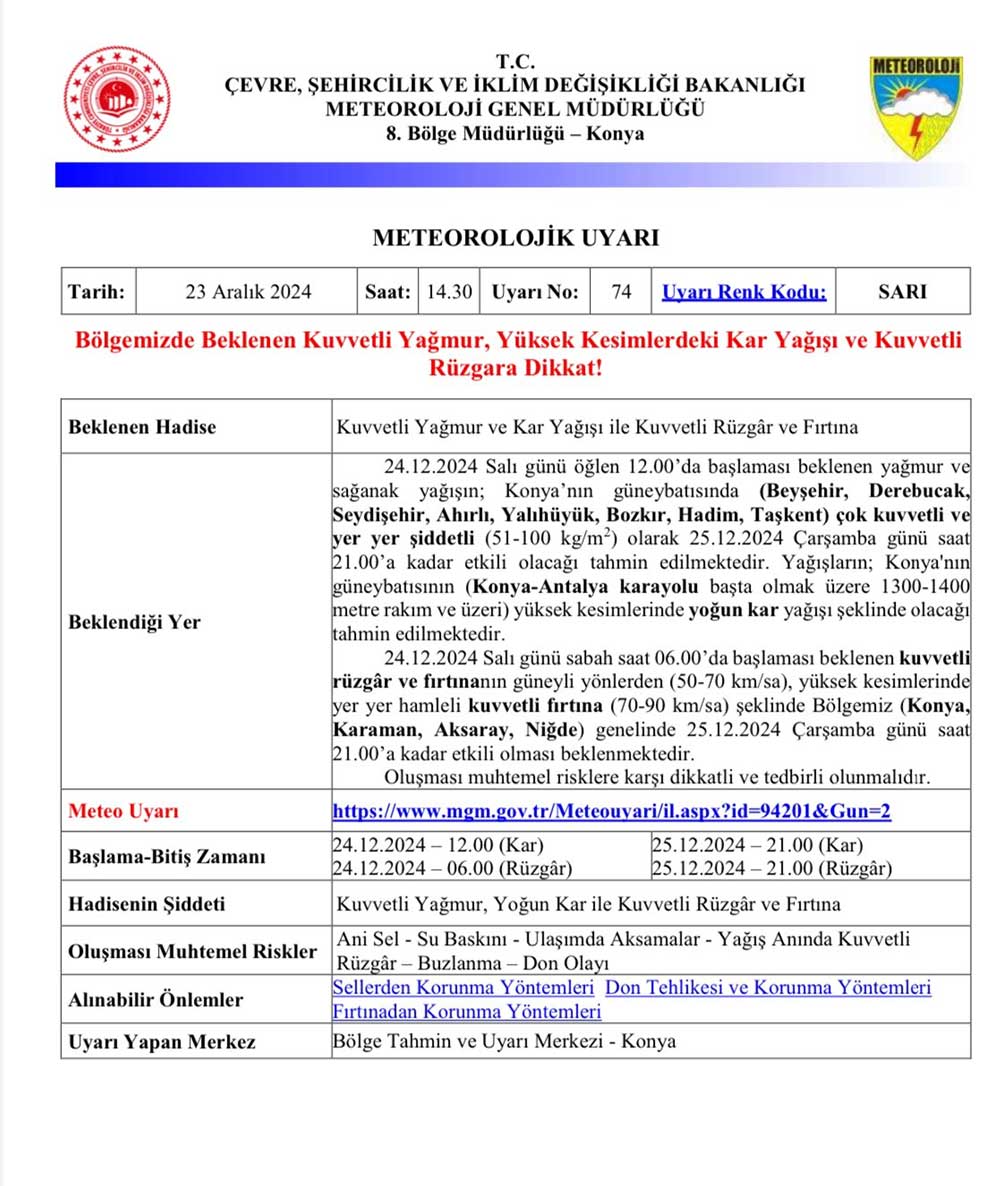 24.12.2024 Salı günü öğlen 12.00’da başlaması beklenen yağmur ve sağanak yağışın; Konya’nın güneybatısında (Beyşehir, Derebucak, Seydişehir, Ahırlı, Yalıhüyük, Bozkır, Hadim, Taşkent) çok kuvvetli ve yer yer şiddetli (51-100 kg/m²) olarak 25.12.2024 Çarşamba günü saat 21.00’a kadar etkili olacağı tahmin edilmektedir. Yağışların; Konya'nın güneybatısının (Konya-Antalya karayolu başta olmak üzere 1300-1400 metre rakım ve üzeri) yüksek kesimlerinde yoğun kar yağışı şeklinde olacağı tahmin edilmektedir.