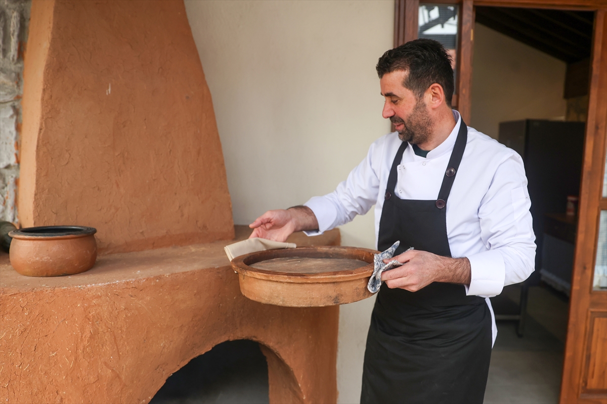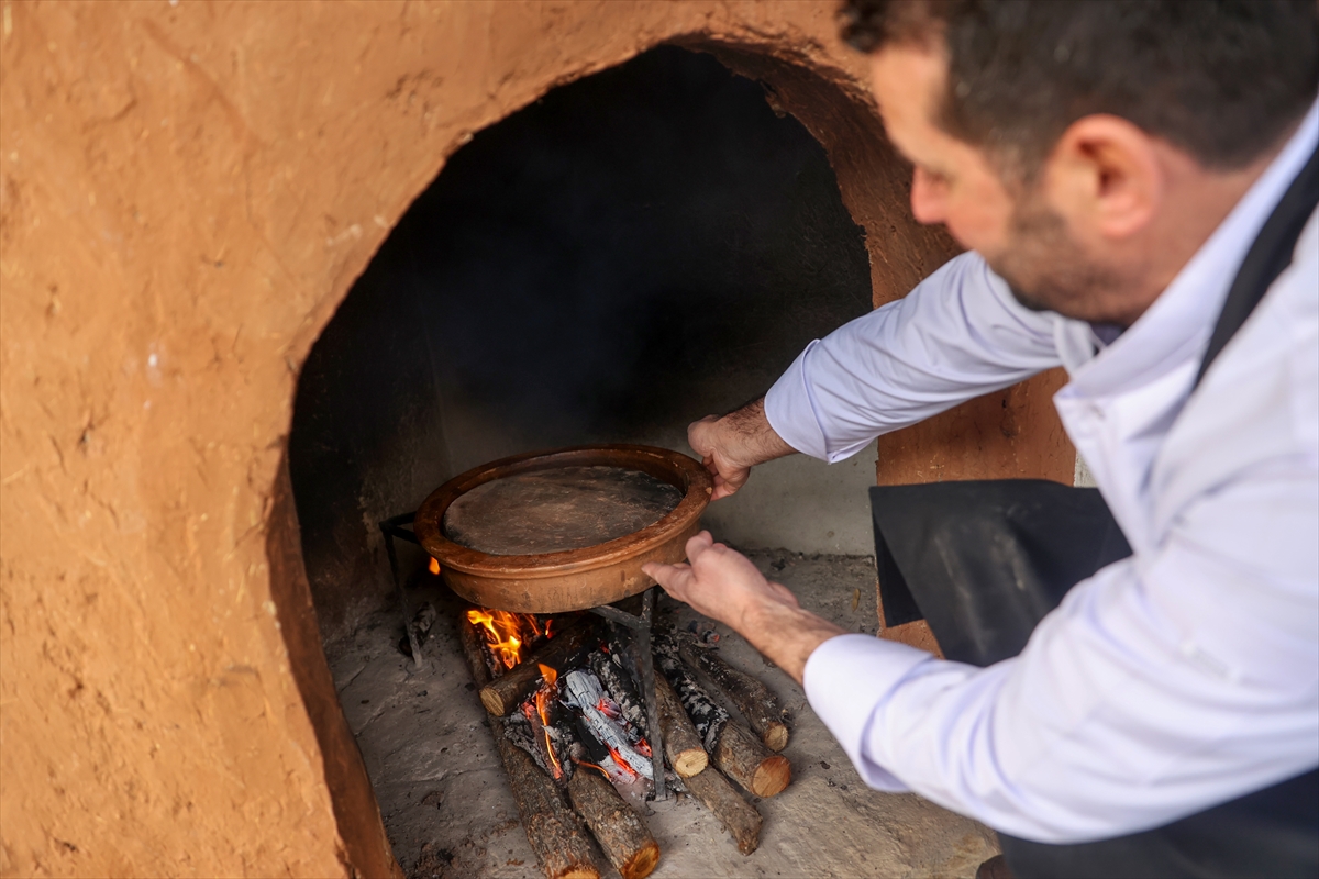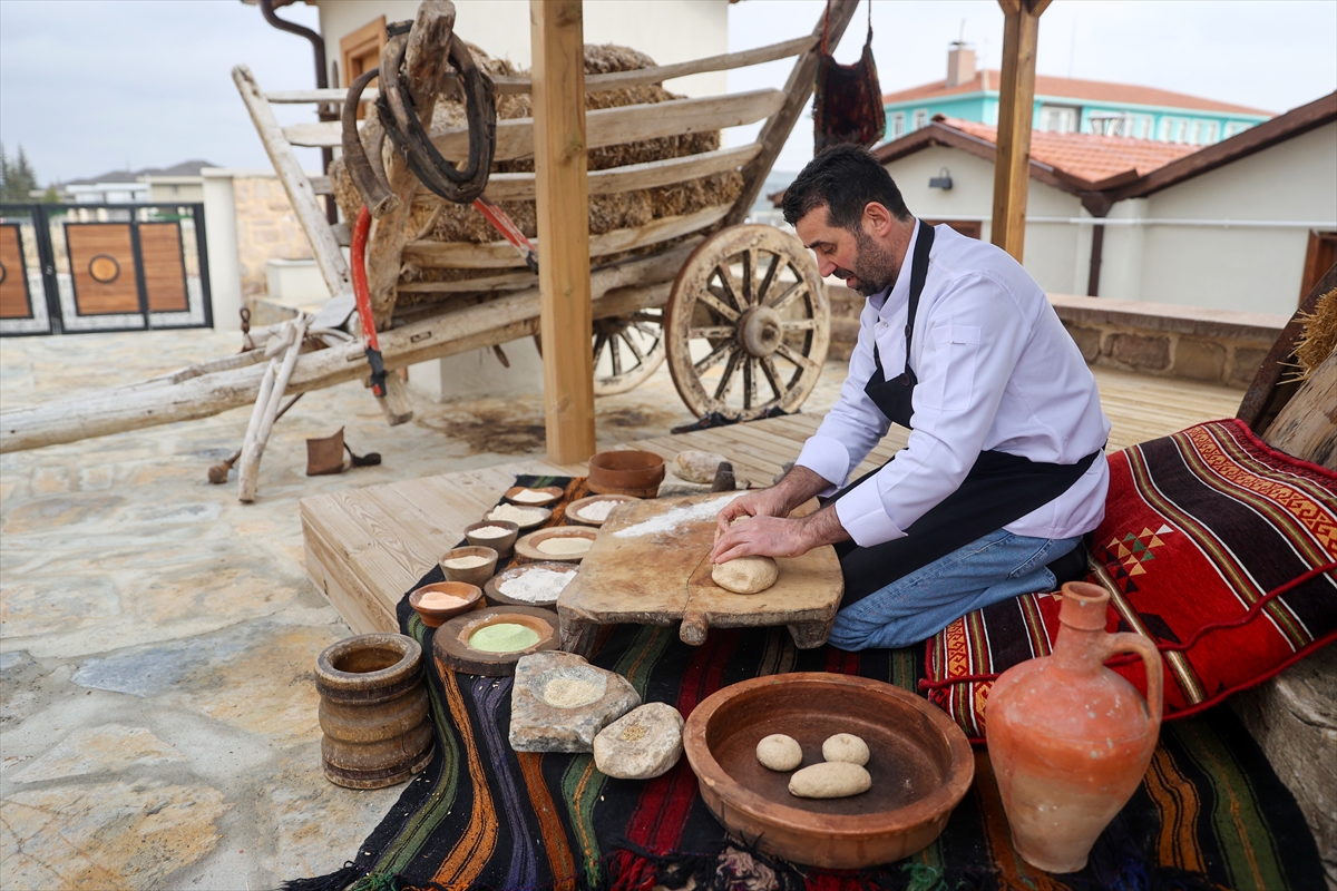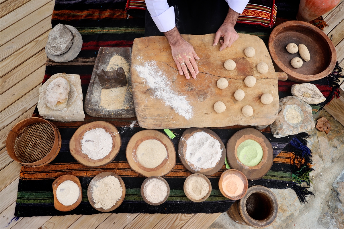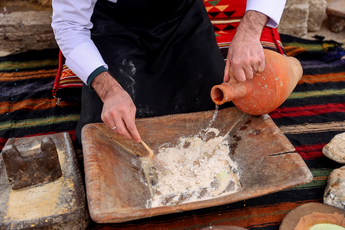 Konya'da Neolitik Çağ yerleşim yeri Çatalhöyük'teki kazıda bulunan ve içeriğindeki tahılların analizlerle tespit edildiği "8 bin 600 yıllık ekmek"ten esinlenen aşçı Ulaş Tekerkaya, bezelye, arpa, buğday ve karaburçaklı ekmek pişirdi.