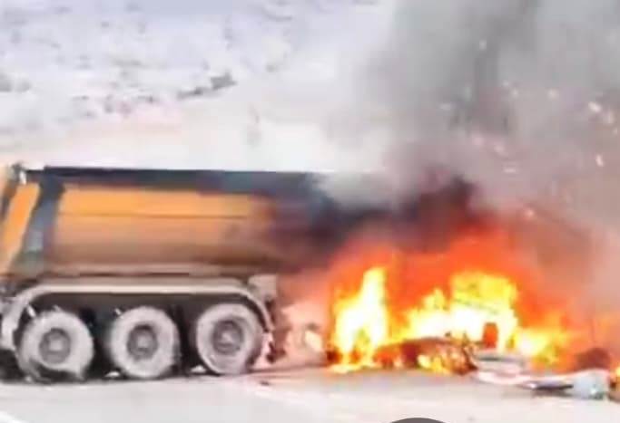 Çarpmanın etkisiyle kamyon alev aldı, yanmaya başladı.