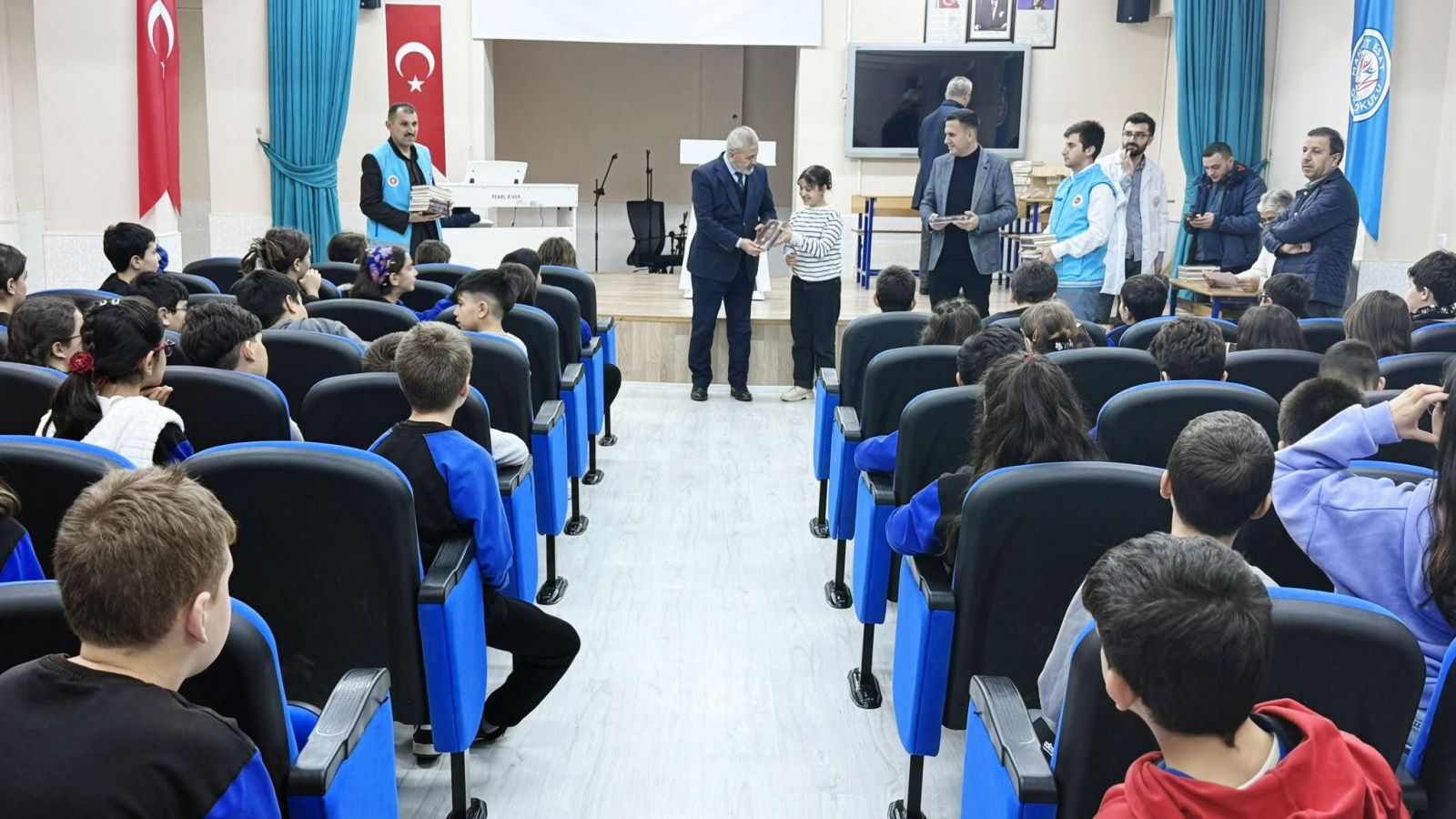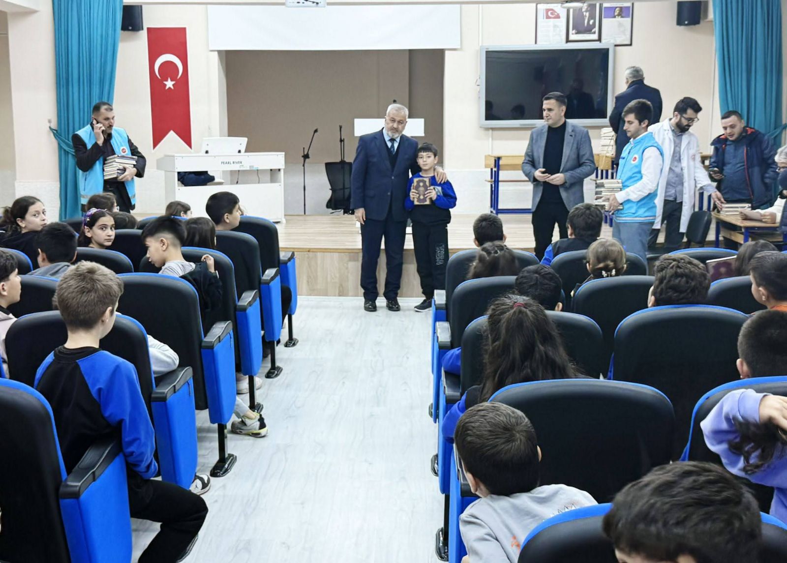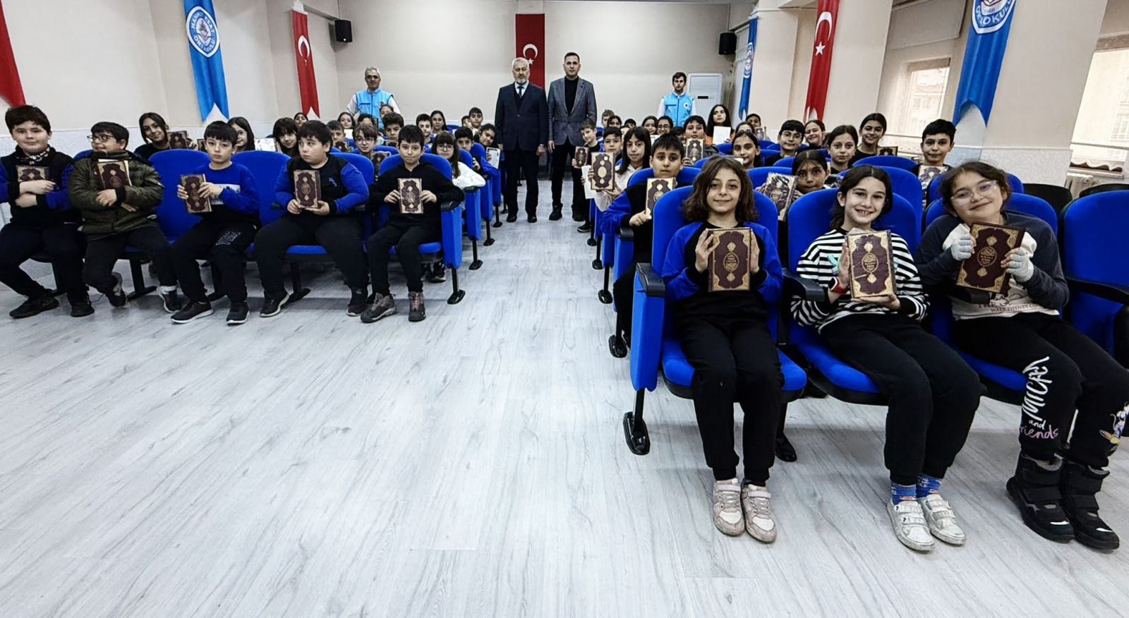 Seçmeli ders olarak Kur’an-ı Kerim’i tercih eden ve kayıt yaptıran öğrencilere, Türkiye Diyanet Vakfı tarafından basımı yapılan Kur’an-ı Kerim’ler teslim edildi. Düzenlenen etkinlikte hediyeleri, İlçe Müftüsü Adem Bebek, Mahmut Esat Ortaokulu Müdürü Süleyman Boztepe, öğretmenler ve Türkiye Diyanet Vakfı gönüllüsü personel birlikte takdim etti.