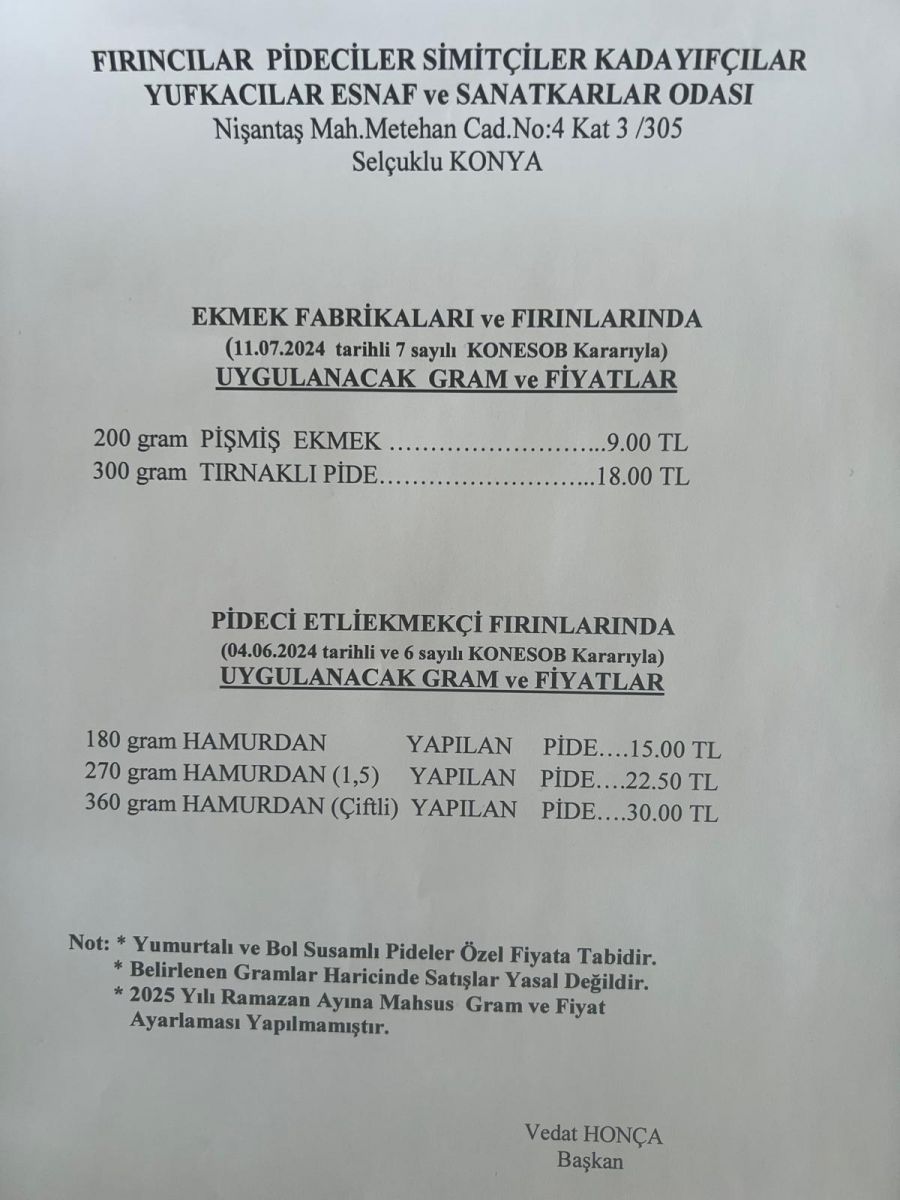 Konya Fırıncılar, Pideciler, Simitçiler ve Kadayıfçılar Odası tarafından alınan karar doğrultusunda 2025 yılı Ramazan ayı için pide fiyatları belirlendi. Ayrıca ekmeğe de zam geldi. Zamlı rakam, Ramazan sonrasında uygulanmaya başlanacak.