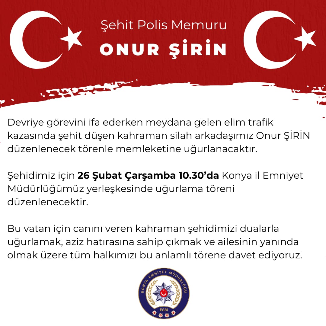 Konya İl Emniyet Müdürlüğünden yapılan yazılı açıklamada, yarın (26 Şubat Çarşamba) İl Emniyet Müdürlüğü yerleşkesinde, vatandaşların da katılımıyla şehit polis Şirin için tören düzenleneceği bildirildi.