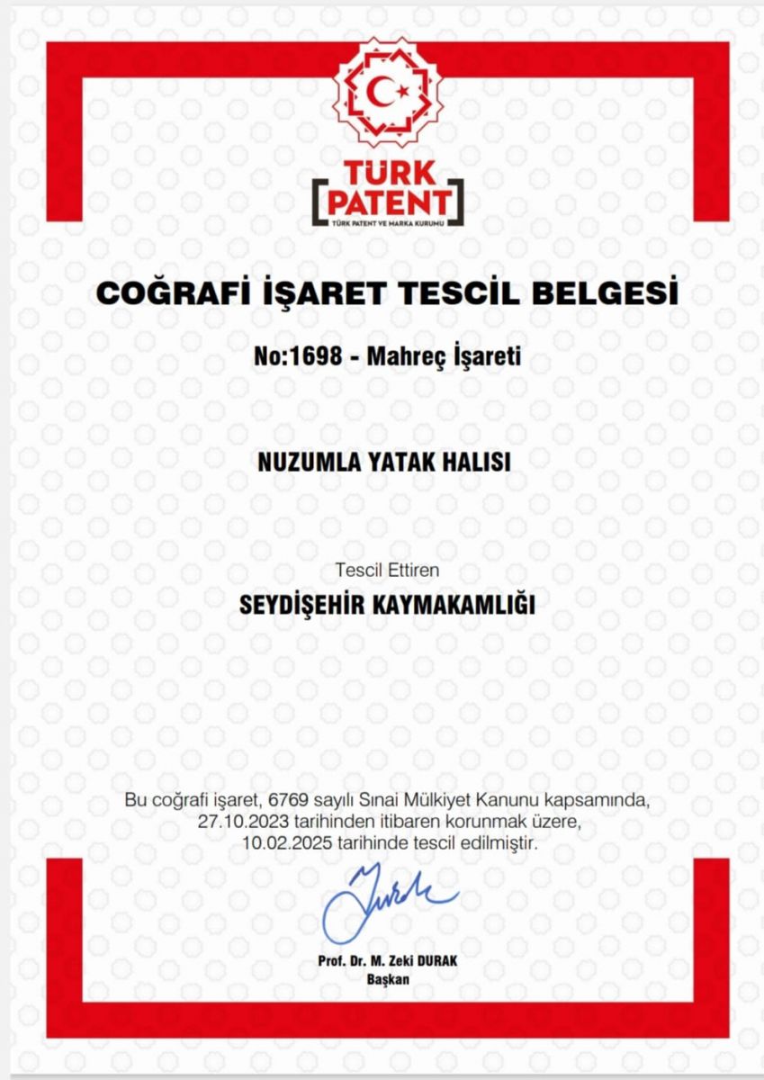 Nuzumla Yatak Halısı, Anadolu'nun "Yaşayan Miras" olarak nitelendirilen bu değerli kültürel varlığı, coğrafi işaret tesciliyle koruma altına alınarak gelecek nesillerle buluşacak. Bu önemli adım, kültürel mirasımızın yaşatılması ve tanıtılması açısından büyük bir kazanım olarak değerlendiriliyor.