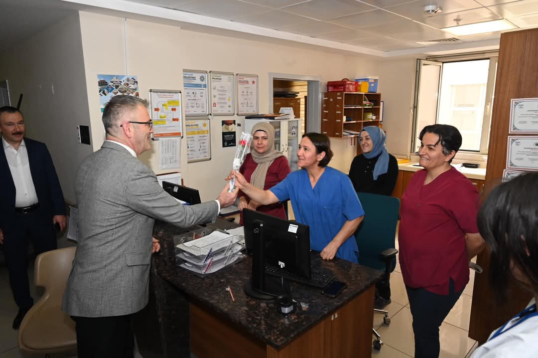 Başkan Ustaoğlu’na hastane ziyaretinde sağlık çalışanları kendilerini unutmadığı için teşekkür ederek çalışmalarında kolaylıklar diledi