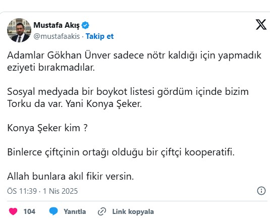 “Adamlar Gökhan Ünver sadece nötr kaldığı için yapmadık eziyeti bırakmadılar. Sosyal medyada bir boykot listesi gördüm içinde bizim Torku da var. Yani Konya Şeker. Konya Şeker kim? Binlerce çiftçinin ortağı olduğu bir çiftçi kooperatifi. Allah bunlara akıl fikir versin.”