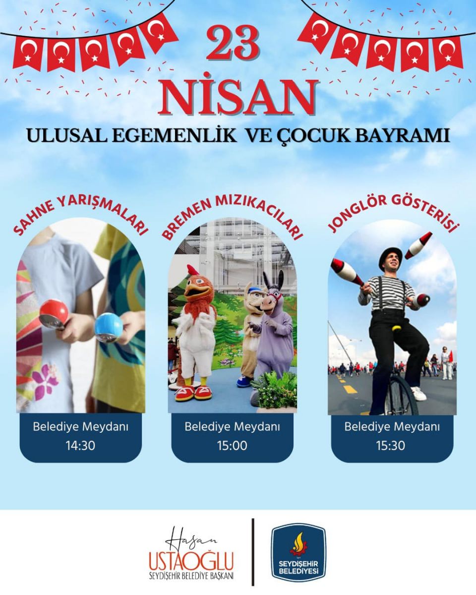 23 Nisan Ulusal Egemenlik ve Çocuk Bayramı Seydişehir Belediyesinin organize ettiği büyük bir etkinlik programı ile Belediye Meydanında kutlanacak.