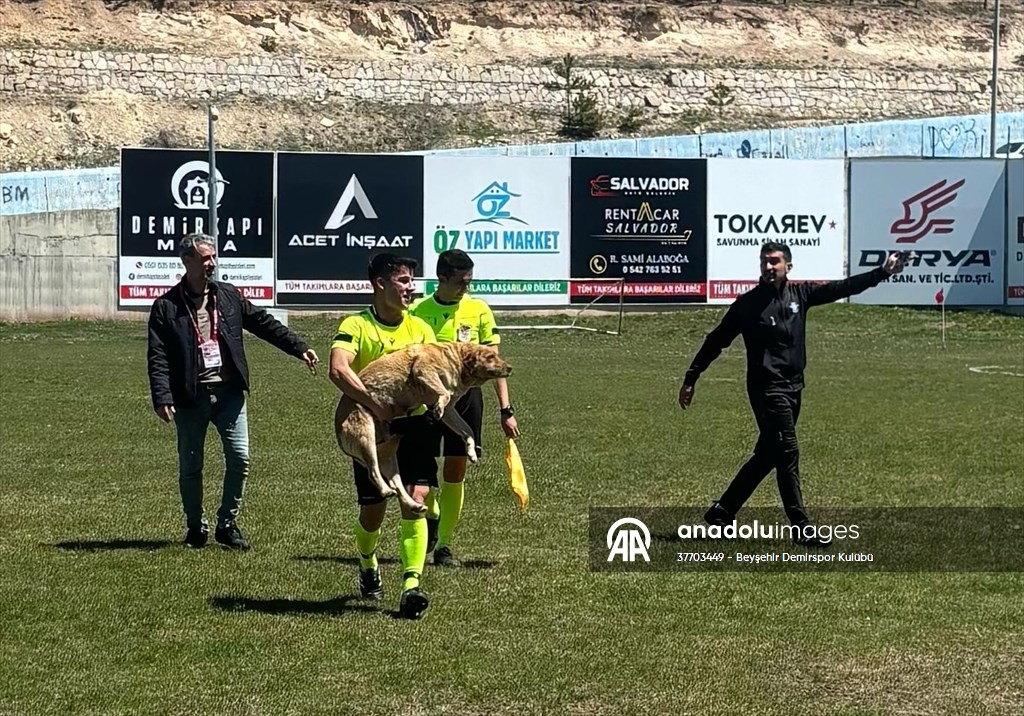 KONYA (AA) - Konya'nın Beyşehir ilçesinde amatör maç sırasında sahaya giren köpek, alanı terk etmeyince hakem tarafından önce kırmızı kart gösterildi, sonra dışarı çıkarıldı.