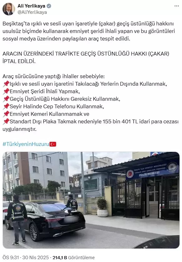 İçişleri Bakanı Ali Yerlikaya şunları söyledi: "Beşiktaş'ta ışıklı ve sesli uyarı işaretiyle (çakar) geçiş üstünlüğü hakkını usulsüz biçimde kullanarak emniyet şeridi ihlali yapan ve bu görüntüleri sosyal medya üzerinden paylaşılan araç tespit edildi. Aracın üzerindeki trafikte geçiş üstünlüğü hakkı (çakar) iptal edildi.
