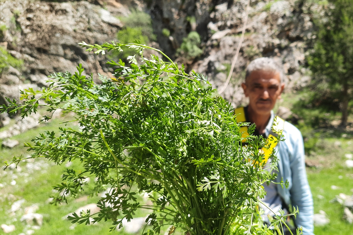 KONYA (AA) - SERHAT ÇETİNKAYA/YAKUP ÇETİN - Konya'nın Bozkır ilçesinde bahar döneminde dağ yamaçlarında doğal yetişen kişniş bitkisinin toplayıcıları, bir aylık hasat sürecinde zamanla yarışıyor.