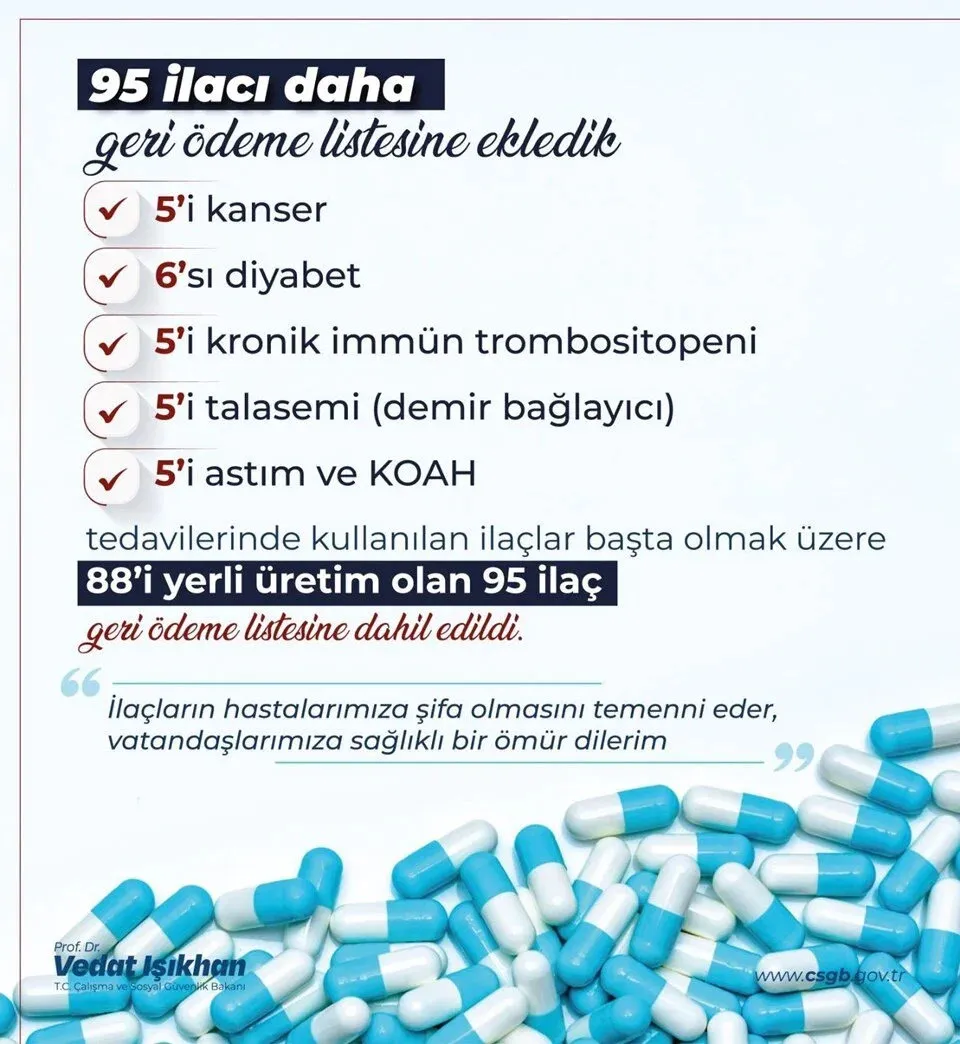 Çalışma ve Sosyal Güvenlik Bakanı Vedat Işıkhan, bazı ilaçların geri ödeme listesine alındığını açıkladı. Bakan Vedat Işıkhan, 95 ilacın geri ödeme alınan ilaçların 88'nin yerli üretim olduğunu söyledi.