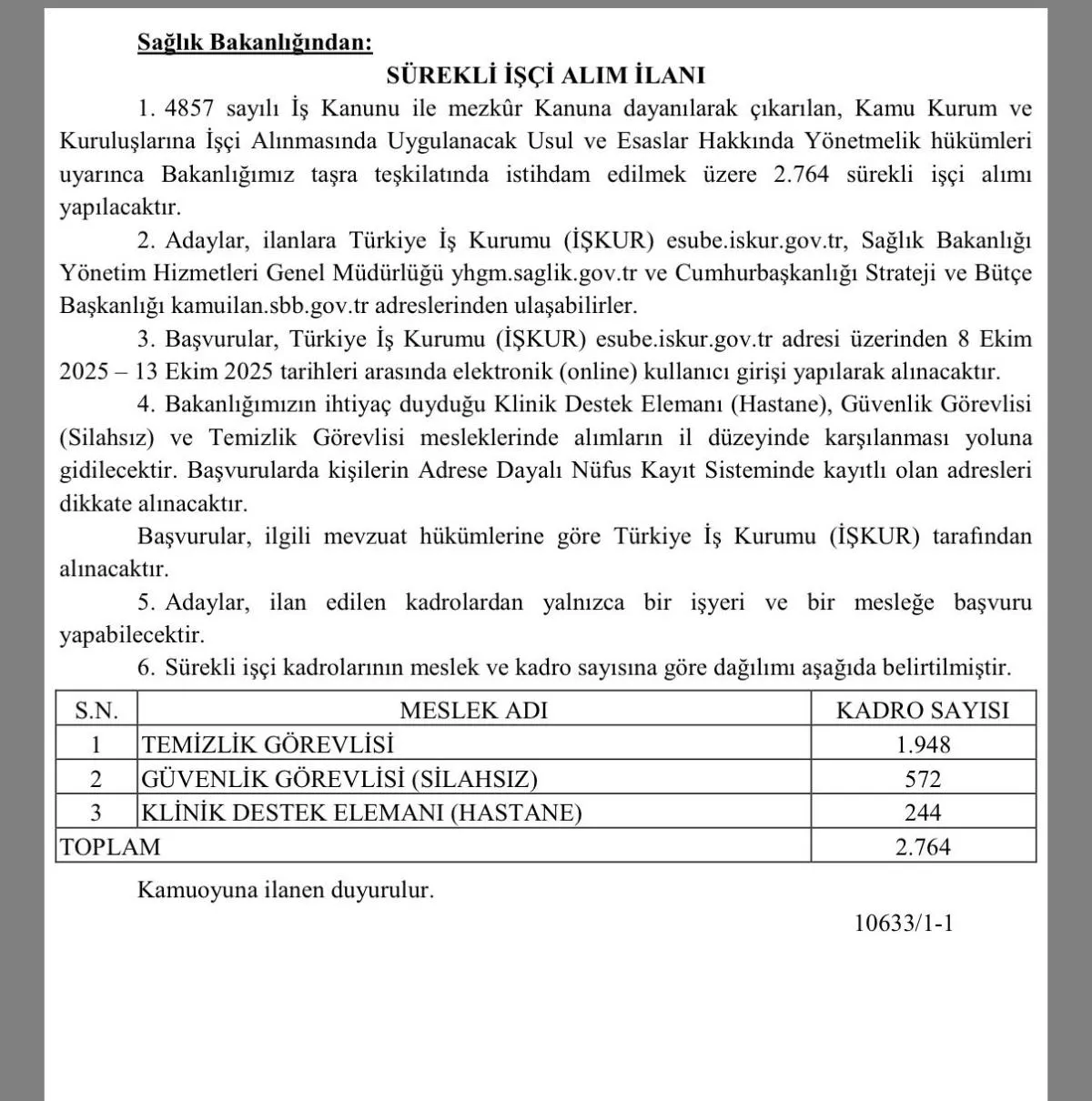 Sağlık Bakanlığı'nın personel alımları devam ediyor. Sağlık Bakanlığı işçi alımı Resmi Gazete’de yayımlandı. Başvurular 8-13 Ekim tarihlerinde alınacak.