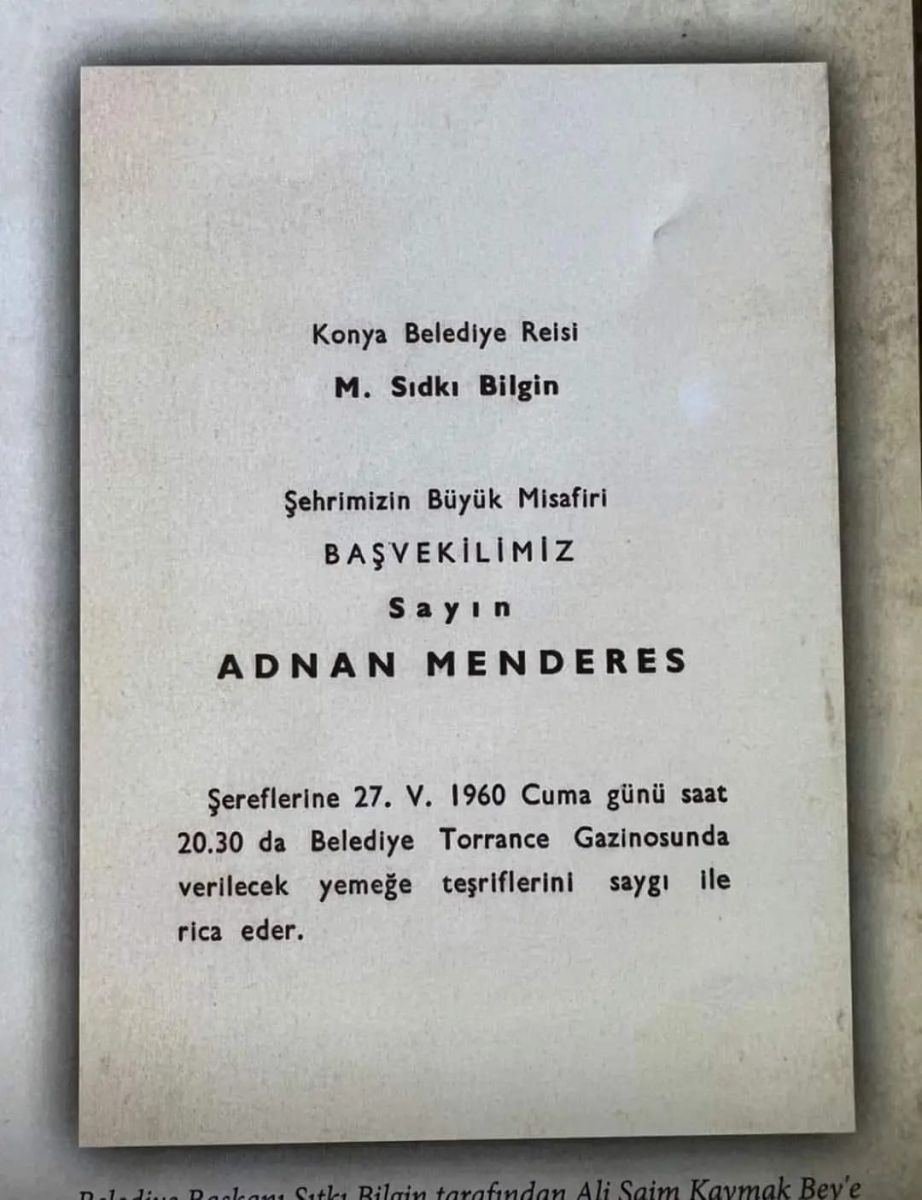 Menderes saat 17:00 de Hükümet Meydanı’nda yapacağı konuşmanın ardından saat 20.30 Konya Belediye Reisi Sıtkı Bilgin tarafından Belediye gazinosunda tertiplenen yemeğe katılacak ve Konya’dan ayrılacaktı.(2)