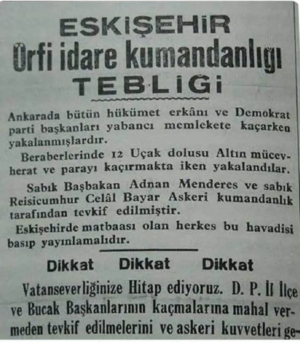 “Ankara’da bütün hükümet erkanı ve Demokrat Parti başkanları yabancı memlekete kaçarken yakalanmışlardır. Beraberinde 12 uçak dolusu altın mücevherat ve parayı kaçırmakta iken yakalandılar. Sabık Başbakan Adnan Menderes ve sabık Reisicumhur Celal Bayar askeri kumandanlar tarafından tevkif edilmiştir. Eskişehir’de matbaası olan herkes bu havadisi basıp yayınlamalıdır.