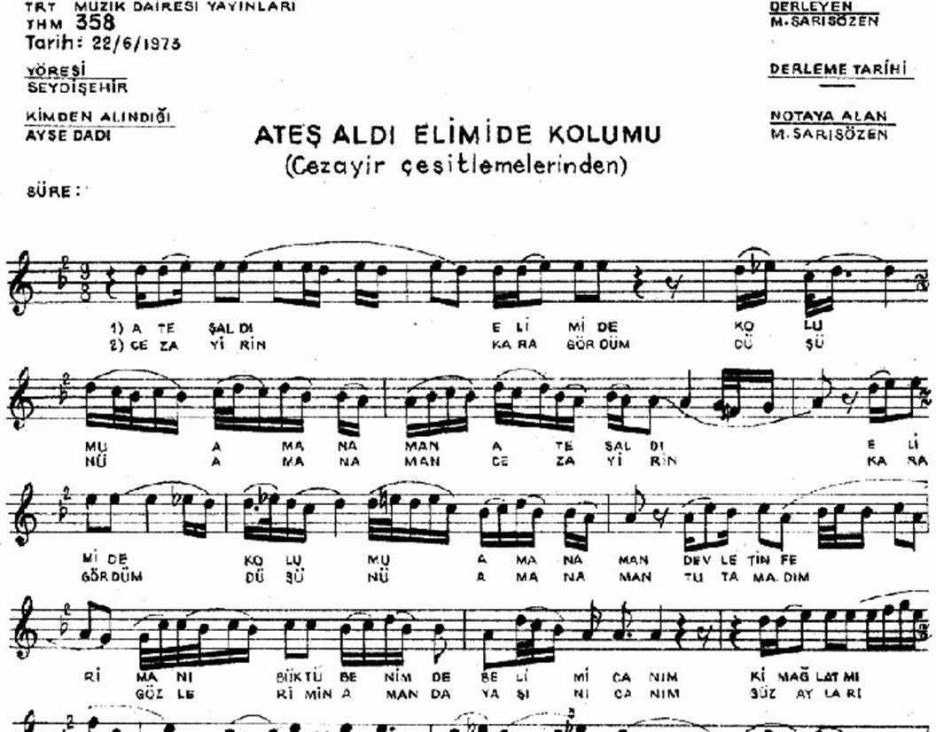 Seydişehir düğünlerinin vazgeçilmezi Ayşe Dadı’dan derlenen,TRT Repertuar Numarası 358 olan Cezayir Türküsü’nün 8 noluversiyonunun sözleri ise şöyledir: