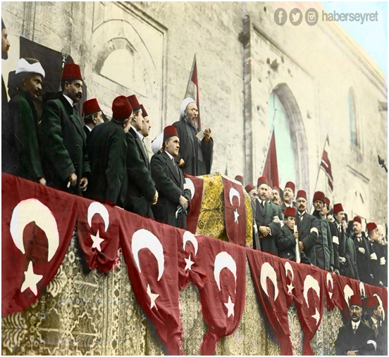 İşte bu fotoğrafta Osmanlı devleti I. Dünya harbinde tüm cihan-ı Müslim’ine cihat çağrısında bulunuyor. Sevgili okuyucularım, bu fotoğraf o kadar ehemmiyetli ki tüm İslamâlemini içinde barındırıyor. Bu fotoğrafın neresinde yeşil, üzerinde “Kelime-i Tevhid” yazan bir bayrak var? Kısacası yok! Sağ üstte görünen bayrak (büyük kapının sağ tarafı) Alman bayrağıdır. Bunun sebebi ise biz, I. Dünya savaşında Almanlar ile ittifak idik…