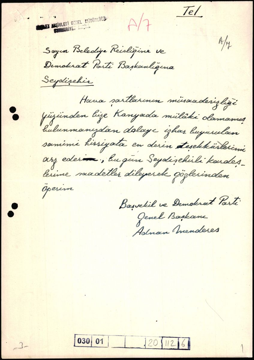 - Adnan Menderes’in telgrafı; BCA.030-01-20-112-6/3