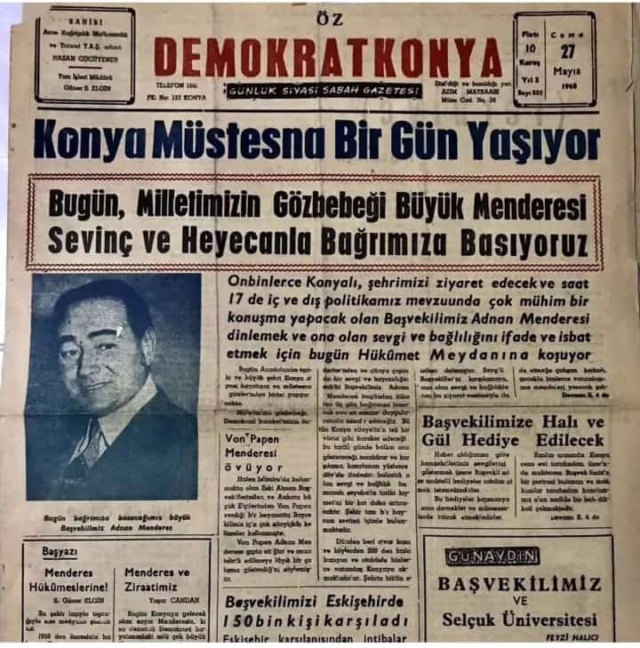 Gelelim konumuzun Konya ile ilgili olan kısmına… Şayet 27 Mayıs darbesi olmasaydı 27 Mayıs 1960 günü Adnan Menderes Konyalılar ile buluşacaktı. Darbeden habersiz baskıya giren “Öz Demokrat Konya” gazetesi 27 Mayıs 1960 Cuma günü Başvekilin Konya’ya geleceğini manşetine taşıyor ve şöyle söylüyordu (1)
