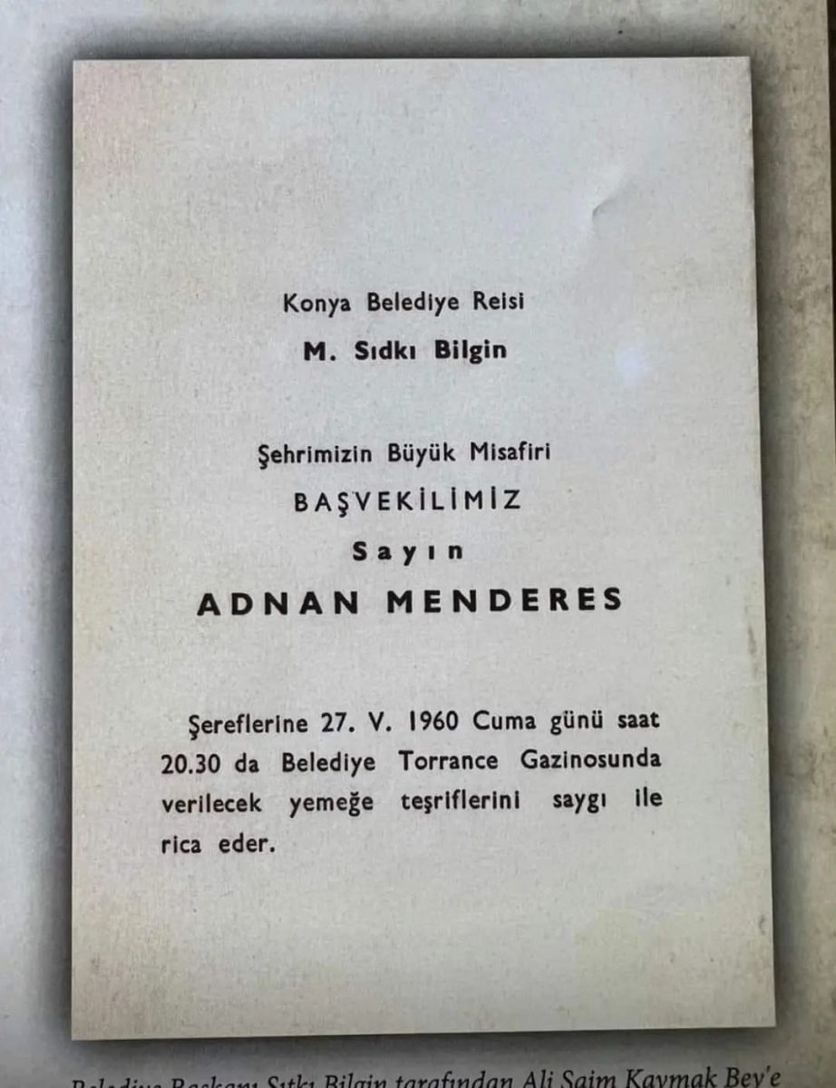 Menderes saat 17:00 de Hükümet Meydanı’nda yapacağı konuşmanın ardından saat 20.30 Konya Belediye Reisi Sıtkı Bilgin tarafından Belediye gazinosunda tertiplenen yemeğe katılacak ve Konya’dan ayrılacaktı. (2)