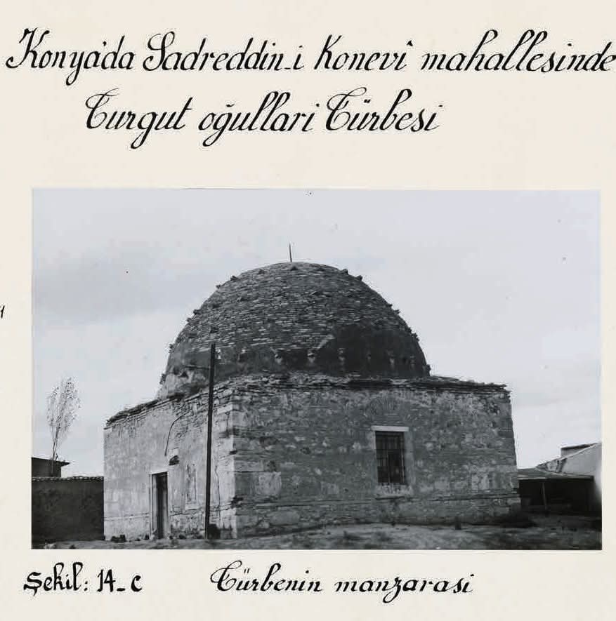 “Şeyh SadrettiniKonevi türbesinin mezarlığı içindeki bu türbe ve etrafındaki Turgutoğullarına mensup veya müntesip Karamanoğlu emirlerinden birçok zevatin kabirleri, 1928 Ekim ayında tarihi ve maziyi sevmeyenlerden birisi tarafından yok edilmişti.